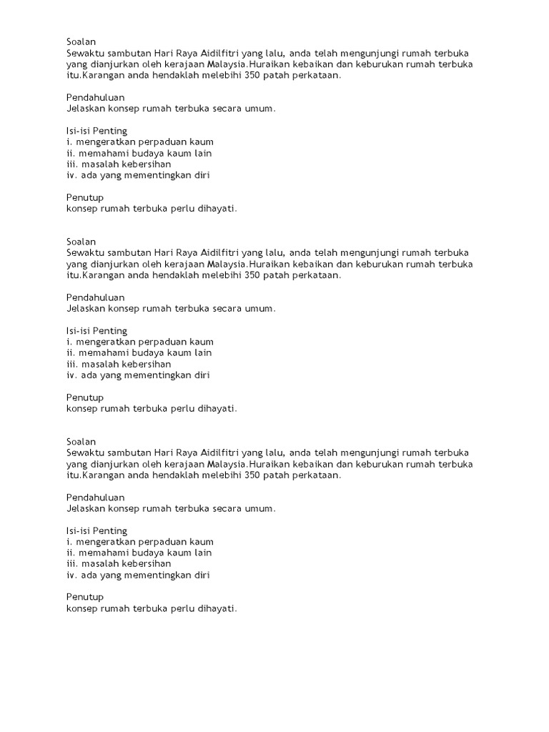 Doc Karangan Cemerlang Spm Kebaikan Amalan Rumah Terbuka Najat Ruhi Academia Edu. Karangan Contoh SPM - Rumah Terbuka Rumah Terbuka Rakyat Malaysia Buku Teks Tingkatan 5 ms 1 Soalan Contoh Sewaktu sambutan Hari Raya Aidilfitri yang lalu anda telah mengunjungi rumah terbuka yang dianjurkan oleh kerajaan Malaysia. Iezlan Syahmie Firdaus A Naim Hafiz 5AK1 SOALAN.