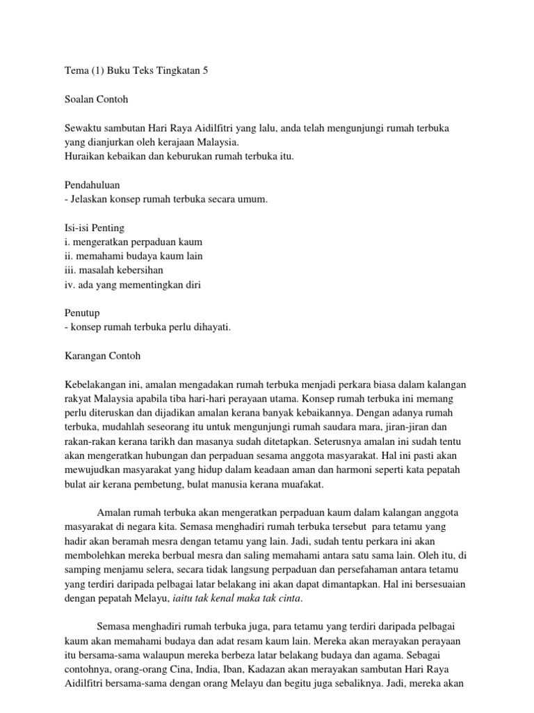 Rumah Terbuka Rakyat Malaysia Buku Teks Tingkatan 5 ms 1 Soalan Contoh. Karangan Contoh Kebelakangan ini amalan mengadakan rumah terbuka menjadi perkara biasa dalam kalangan rakyat Malaysia apabila tiba hari-hari perayaan utama. PdPR kali Kedua Salin Bahagian 1 yang mengandungi Soalan Pendahuluan Isi 1 dan Isi 2 untuk satu sesi pembelajaran pertama.