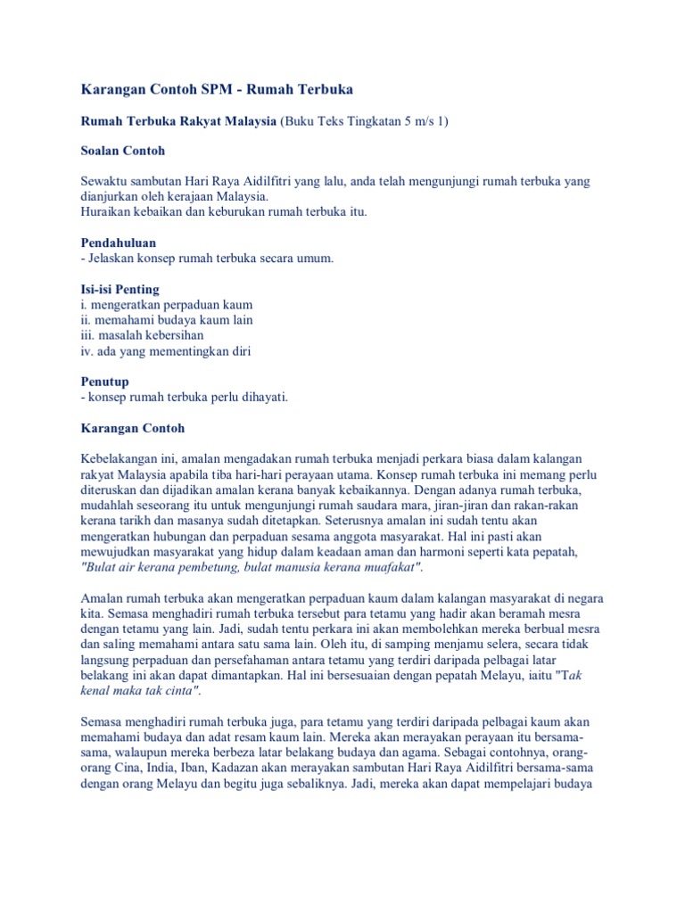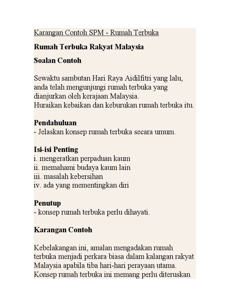 Karangan Contoh Spm Docx Document. Karangan Rumah Terbuka Rakyat Malaysia Rabu 24 November 2021 Tambah Komentar Edit. Kebaikan Dan Keburukan Rumah Terbuka.